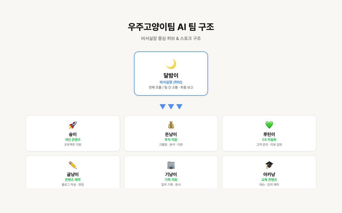우주고양이팀는 비서실장 중심의 허브 & 스포크 구조로 운영돼요.