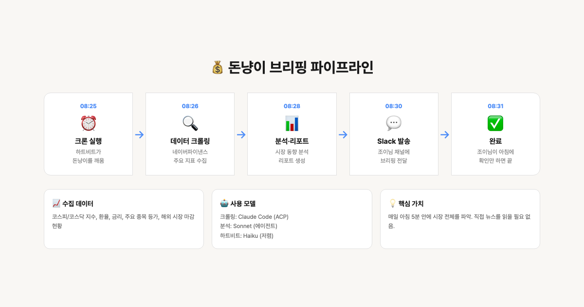 • 크론 → 돈냥이 → ACP → Claude Code → 크롤링 → Slack 6단계 파이프라인