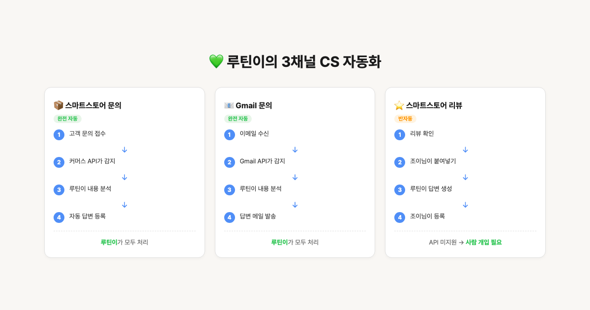 - 루틴이는 3채널(스마트스토어 문의, Gmail, 리뷰)의 CS를 처리